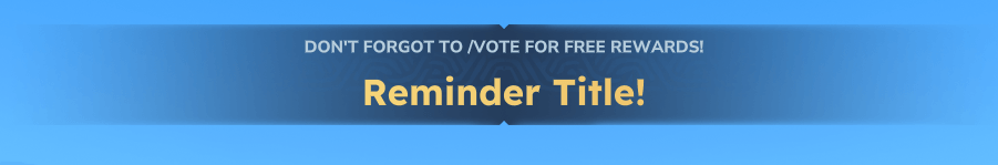 { "Включено": правда, "SendOnJoin": правда, «ExpireAfterHours»: 24 «DelayInMinutes»: 1 «Послание»: «<red><b>Heads Up!</b></red> <gray>Вы сегодня не голосовали! Сделайте это с помощью <green>'/vote'</green>, чтобы получить бесплатные награды!</gray>, "Название": { "Включено": правда, «Заголовок»: «Напомнить название!» "Подзаголовок": Не забудьте проголосовать за бесплатные награды! "Второй период": 3, "FadeInSeconds": 0,5, "FadeOutSeconds": 0,5 ? "Уведомление": { "Включено": правда, «TitleMessage»: «<#e2b0ff>Напоминание!</#e2b0ff>» «Послание описания»: «<gray>Не забудьте <#9f44d3>/vote</#9f44d3> для бесплатных наград!» «IconItem»: «Tool_Growth_Potion» ? "Звук": { "Включено": правда, "Звук": "SFX_Player_Pickup_Item", «SoundCategory»: «UI» ??