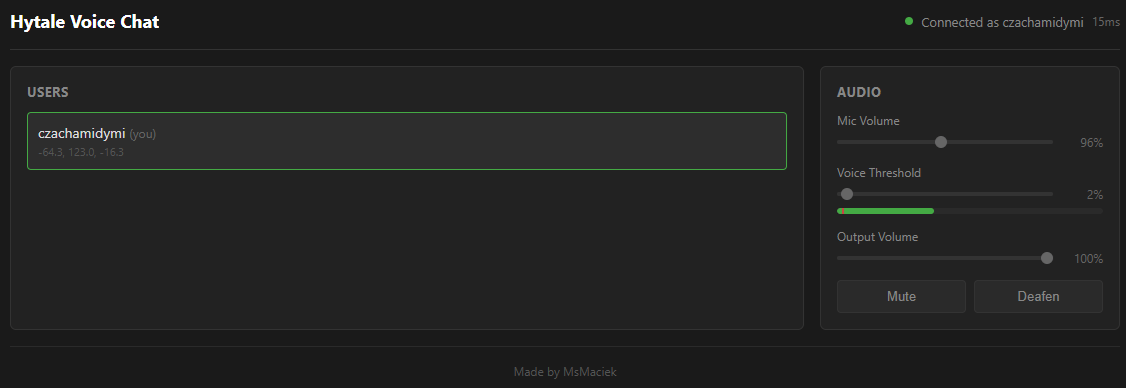 HyVoiceChat is a proximity voice chat mod for Hytale servers. It allows players to communicate through voice based on their in game position and distance, creating a more immersive multiplayer experience until Hytale develops its own Voice Chat.