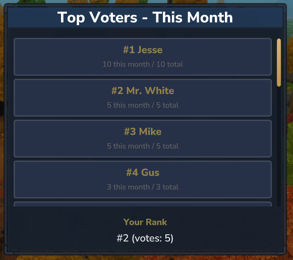 /votetopЕжемесячные и все время лучшие избиратели - Напоминания о голосовании Напомните игрокам, которые не голосовали в течение долгого времени.