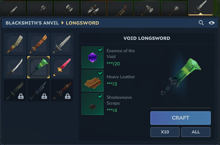 - New tabs including recipes in Weapon Bench: Axes (6 additional recipes), Clubs (5 additional recipes), Longswords (7 additional recipes)