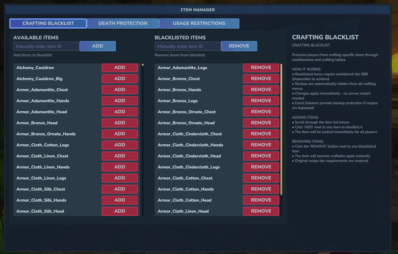 - Crafting Blacklist: Click the "Crafting Blacklist" tab → Type item ID → Click "Add"