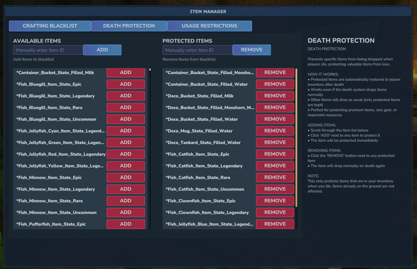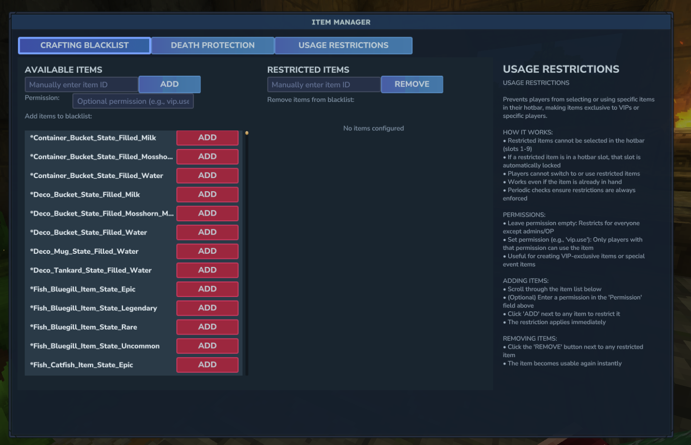Advanced item management plugin for Hytale servers. Control crafting, usage, and death protection for any item. Features real-time updates, permission-based restrictions, and a beautiful GUI. Perfect for VIP systems and server economy control.
