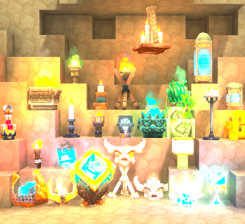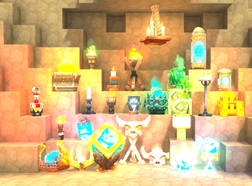 В настоящее время здесь разблокированы только лампы, свечи и факелы. Моя цель - реализовать все декоративные блоки без рецепта крафта в будущем. Вы можете создать эти предметы в мебельном рабочем столе.