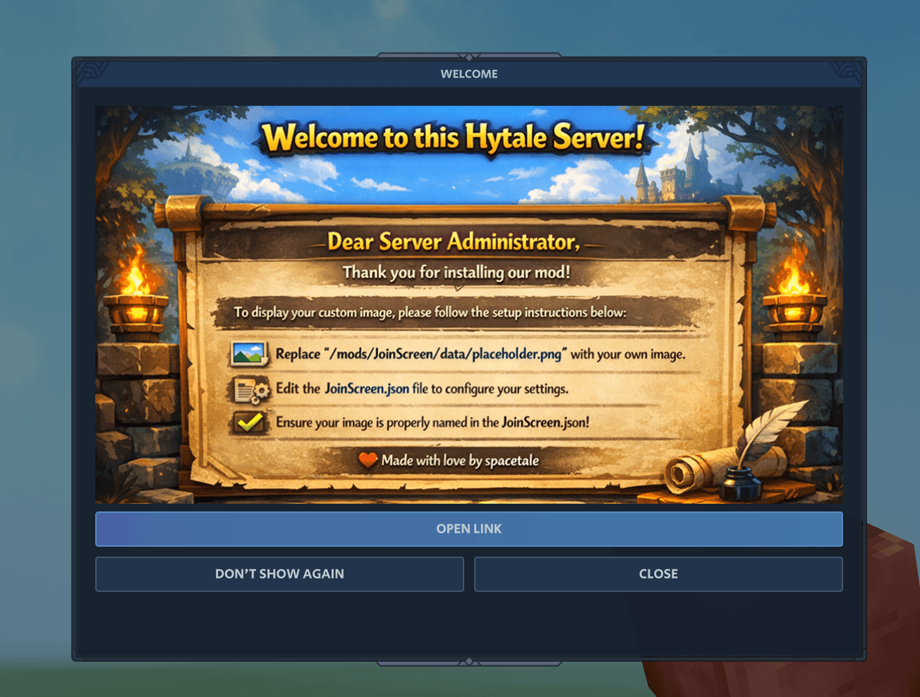 "Enabled": true| Should we enable the mod?"ShowEveryJoin": true| Show the screen for each server-login"CooldownSeconds": 0| Minimum cooldown before showing again to a logging user."LockSeconds": 5| Lock the buttons, forcing the user to read for X seconds."AllowDontShowAgain": false| Allow the user to select to never see it again. (will ignore past preferences if false)"DontShowAgainText": "Don't show again" |Customize the text for the `don't show again`."Title": "Welcome to the Hytale Server"| Customize the title of the UI window."TextAbove": "Example"| An optional text that will be shown above the image."TextBelow": "Another Example"| An optional text that will be shown under the image."CloseButtonText": "I agree"| Customize the text for the dialogue closing button."LockedCloseButtonText": "Please wait..."| Customize the text for the still locked buttons."ShowUrlButton": false| Should we show a link (URL) button?"UrlButtonText": "Open link"| Customize the text for the link button."Url": "https://spacetale.net/example"| The link that will be sent upon clicking the above button."CloseAfterUrl": false| Should the dialogue close after opening the URL?"Image": "placeholder.png"| The name of the image you're using in the /JoinScreen/Data folder."DataImageFileName": "placeholder.png"| The name of the image you're using in the /JoinScreen/Data folder."AutoRepackJarOnStart": true| Ignore and leave on true for now."AutoSizeWindow": true| Auto-detection for image size + buttons to make perfect window size."MaxWindowWidth": 1200| Maximum window width"MaxWindowHeight": 900| Maximum window height