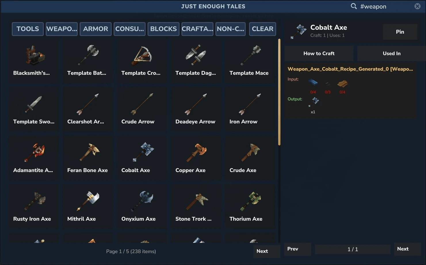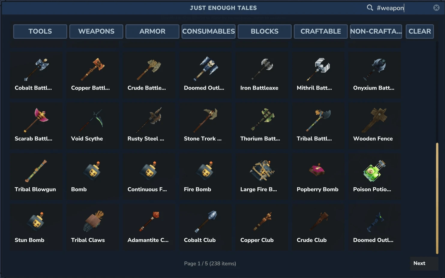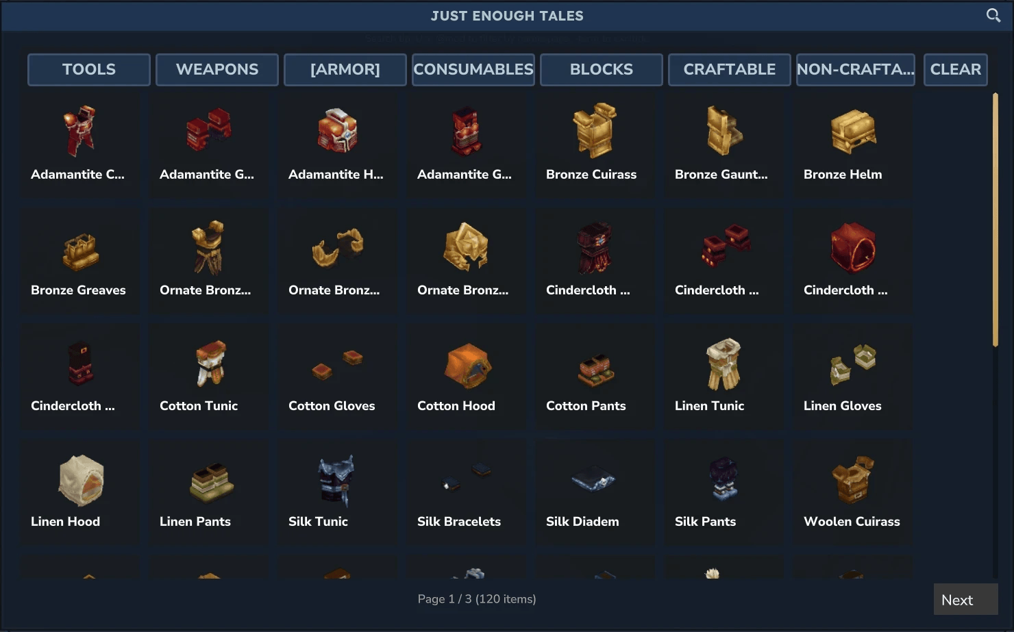 -termto exclude items from results - Category Filters: Quick-access buttons for Tools, Weapons, Armor, Consumables, Blocks, and more