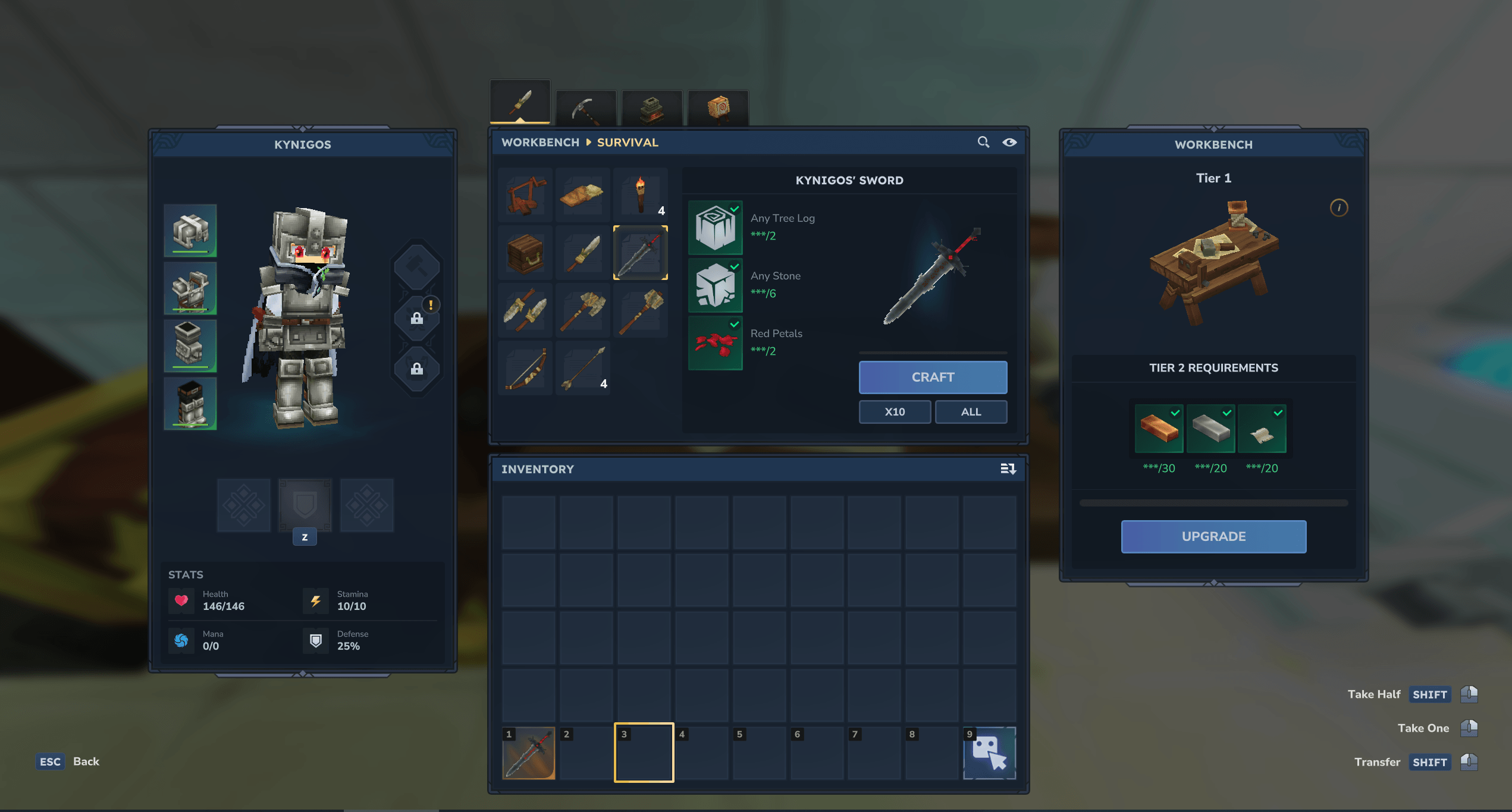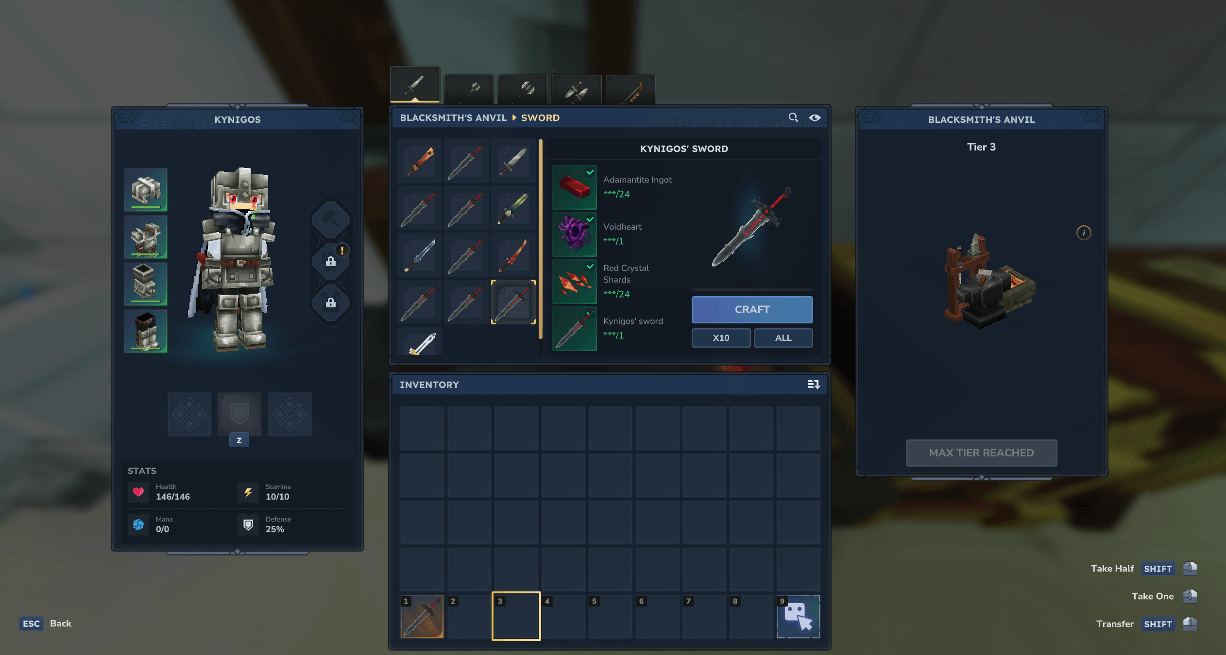 Добавлен уникальный меч, который можно модернизировать через 8 различных ярусов, укрепляясь с каждым обновлением. Каждое обновление требует создания предыдущего уровня с новыми материалами и предназначено для жизнеспособности от ранней игры до поздней прогрессии игры. Я стремился сбалансировать как оружие, так и необходимые материалы, давая цель некоторым недоиспользованным ресурсам.