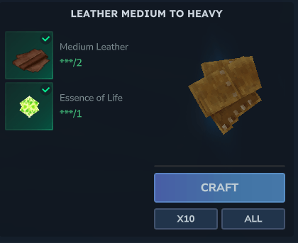 - Heavy Leather <- 2 Medium Leathers and 1 Essence of Life.