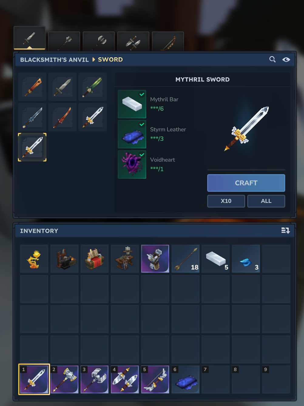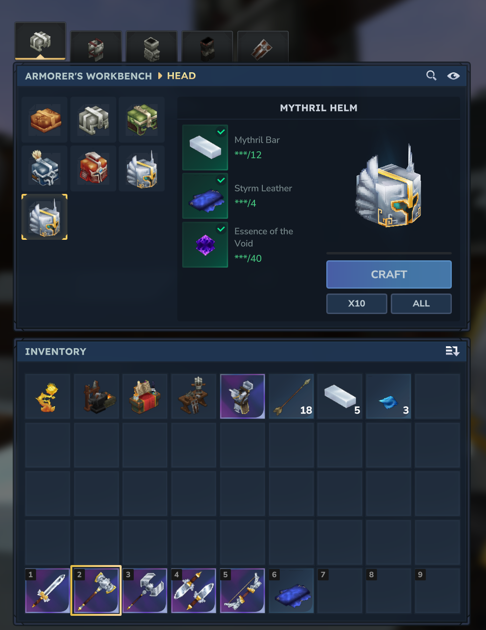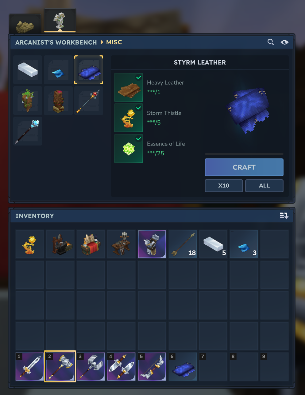 Все ингредиенты изготавливаются на Arcanebench, а оружие, доспехи и инструменты находятся на их соответствующей скамейке.