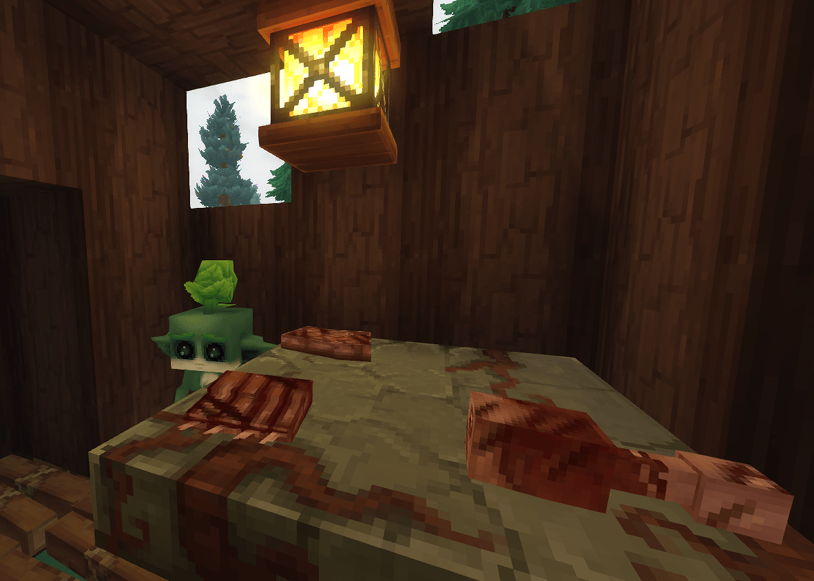 - Мировой декор: Вы можете разместить сырое или приготовленное мясо на столах, прилавках или в жилищах Kweebec, чтобы украсить окружающую среду.