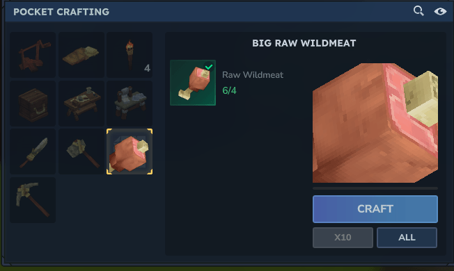 - Big Raw Wildmeat (Crafting): This item can be prepared through Pocket Crafting.