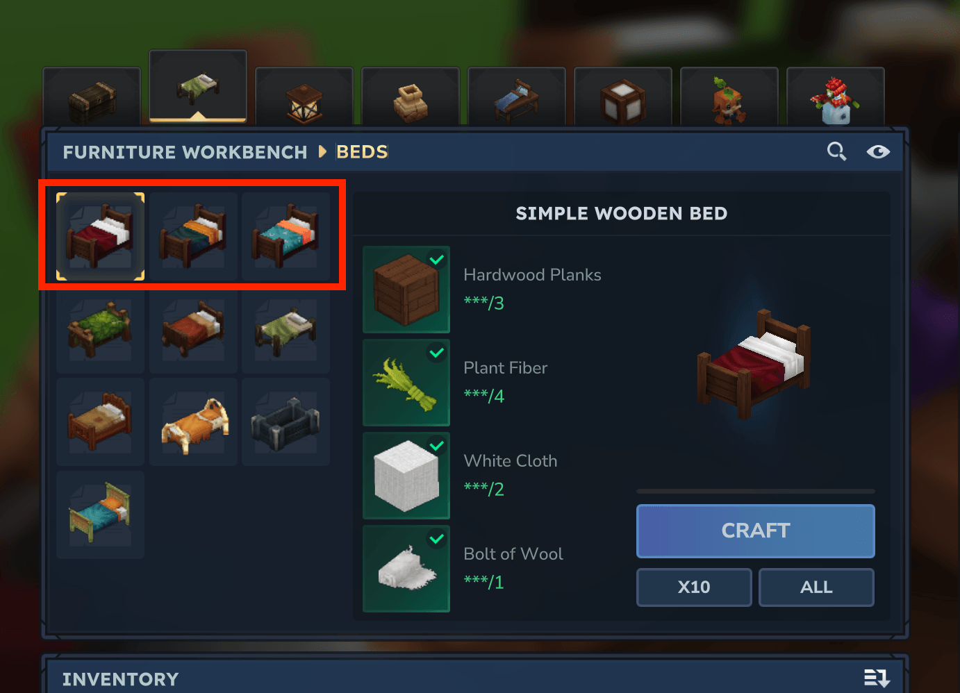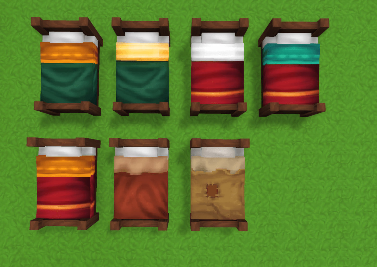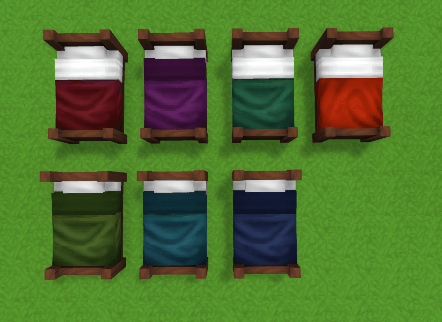You can find 3 kinds of beds in the Furniture Bench; Patterned (6), Solid (7), and Half (7). Switch between the different variants using the Builder's Hammer!