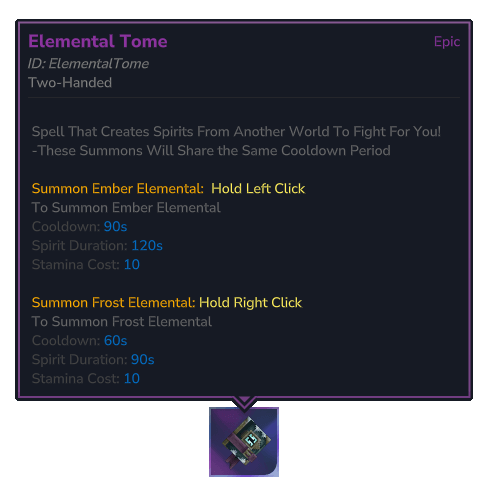 Adds 2 Unique Tomes that Summon 2 Seperate Summons Each 1 being the undead and the other being Elemental Spirits, Craftable from the Arcanist's Workbench, which then allows you to summon either of your summon dending on using Left or Right click on your mouse to summon your creatures,