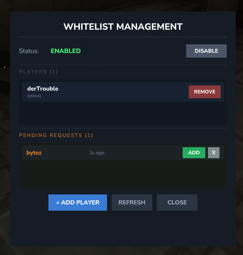 - Smart Pending Requests - When rejected players try to connect, they appear in a pending list for instant approval.