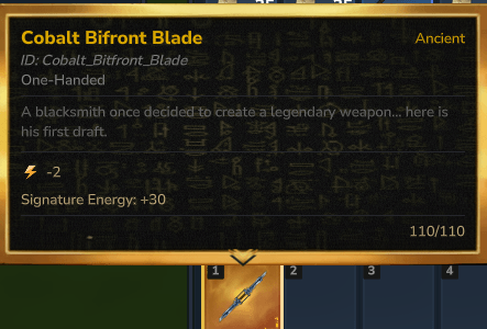 Двустороннее оружие с симметричными лезвиями, простирающимися вверх и вниз от центрального захвата, вдохновленное двуличным богом Янусом. Прогрессивная 5-уровневая система от железной до легендарной древней реликвии.