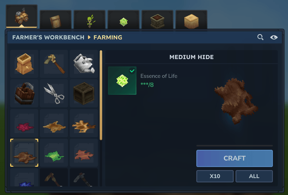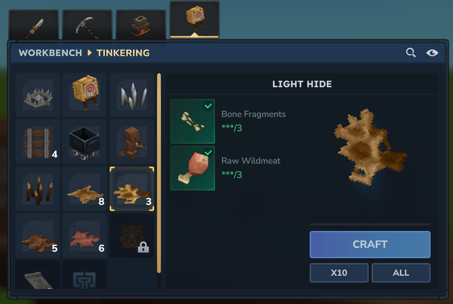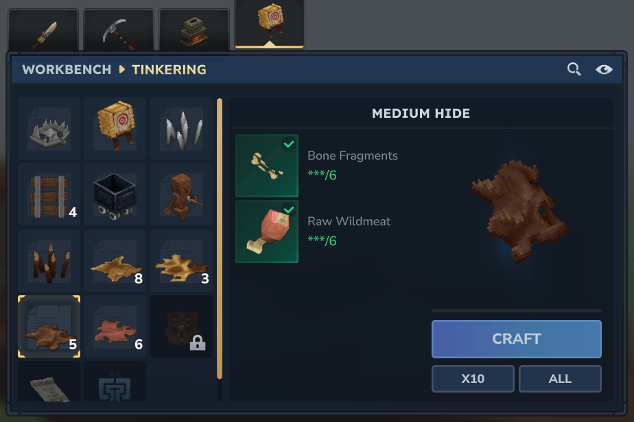 - You can now craft Medium Hide from 6 Raw Wildmeat & 6 Bone Fragments.