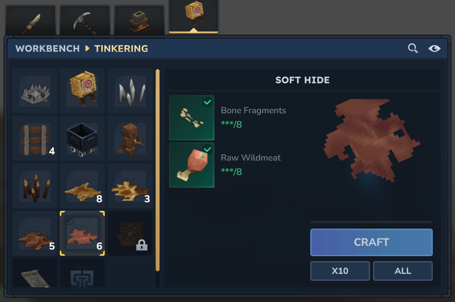 - You can now craft Soft Hide from 8 Raw Wildmeat & 8 Bone Fragments.