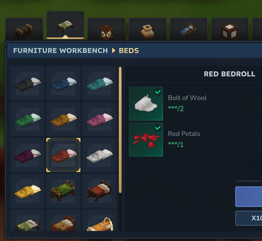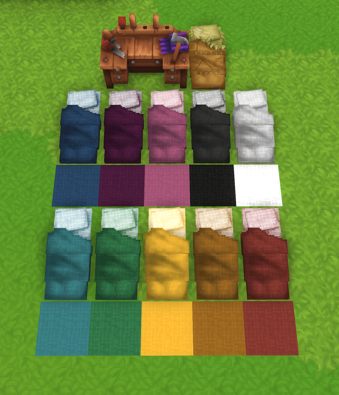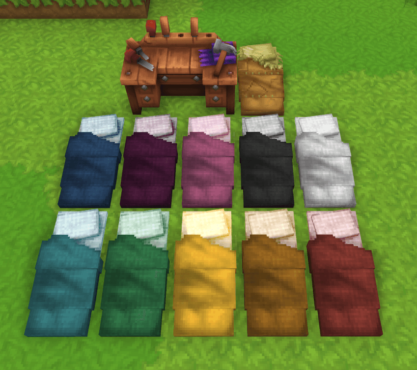 This mod adds 10 new colored Bedrolls, with a custom model to make them neater than the Crude Bedroll, and they come in all the main cloth colors (excluding light/pastel variants, but these might come later if it's requested). You craft them in the furniture bench with 2 bolts of wool and 1 petal of whatever color you want.