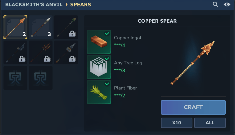 - Spears (available as both craftable items and enemy drops)