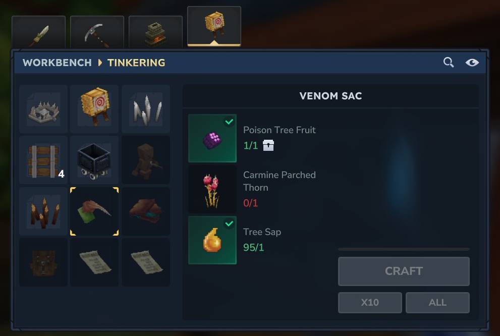 Веном Сак Изготавливается из ядовитого древесного фрукта, кармина, выжженного шипа и древесного сока. Его можно найти в Workbench под вкладкой Tinkering.