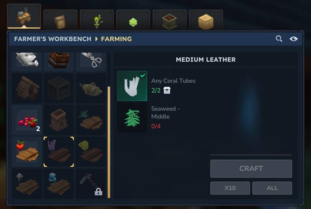 кожа Производится в Farmer's Workbench и может быть найден под вкладкой Farming. Каждый вариант кожи имеет 2 разных рецепта: