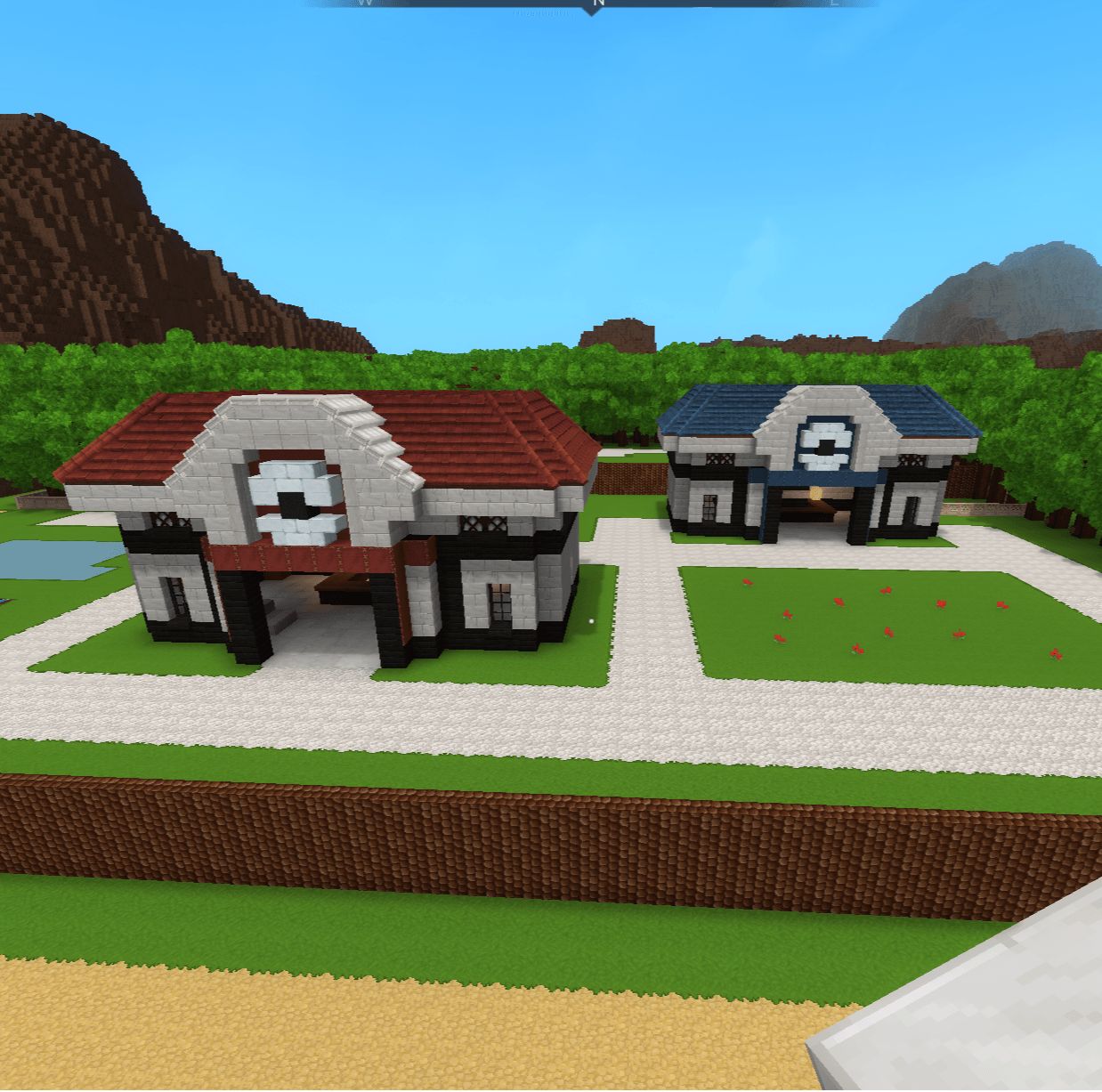 Prefab of a PokéCenter and PokéShop in the Hytale universe, in the hope of a Cobblemon game coming soon.
