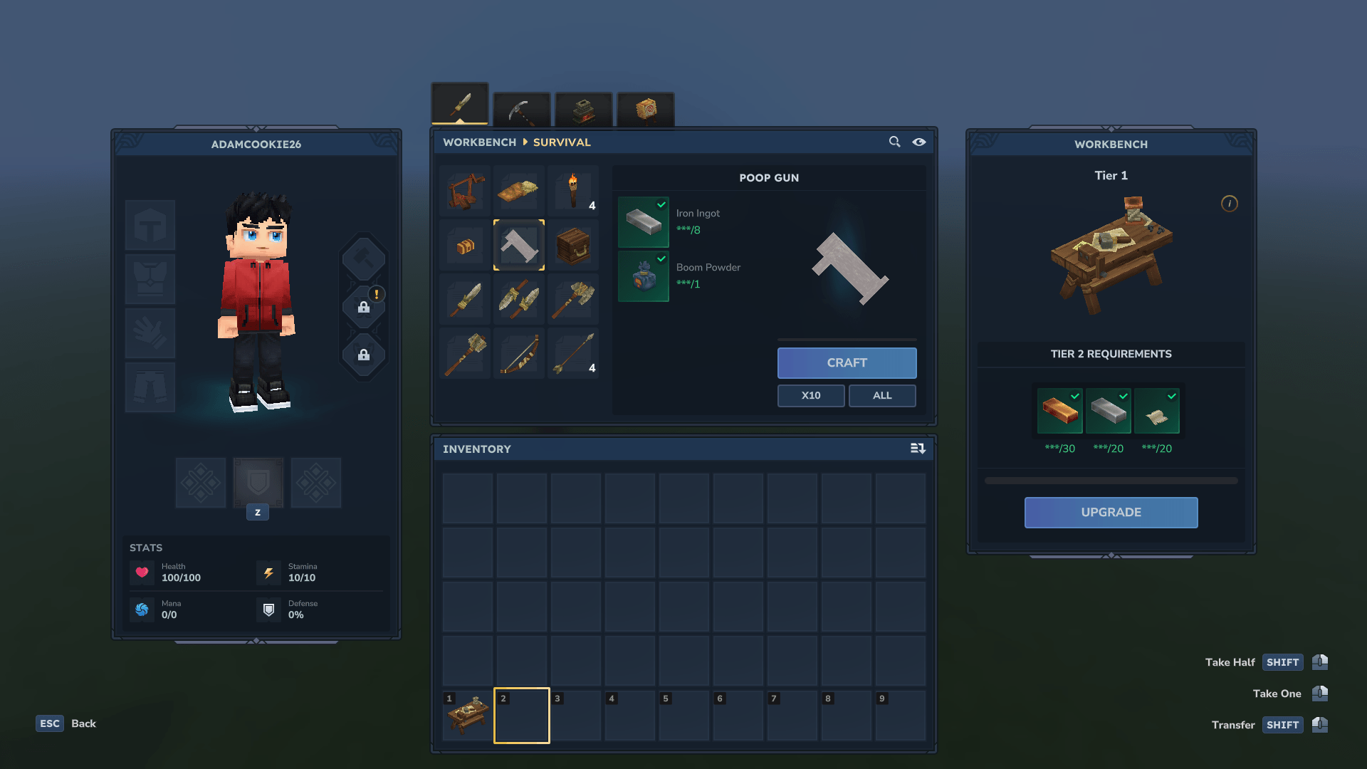 1 Poop Gun = 8 Iron Ingots, 1 Boom Powder - Workbench Tier 1