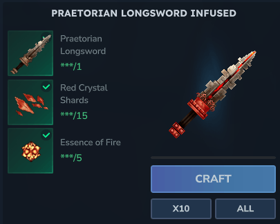 By imbuing the blade with Fire Essence and Red Crystals IN THE ARCANIST WORKBENCH, the Praetorian Longsword gains: