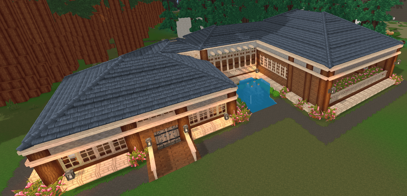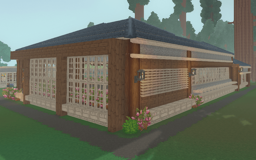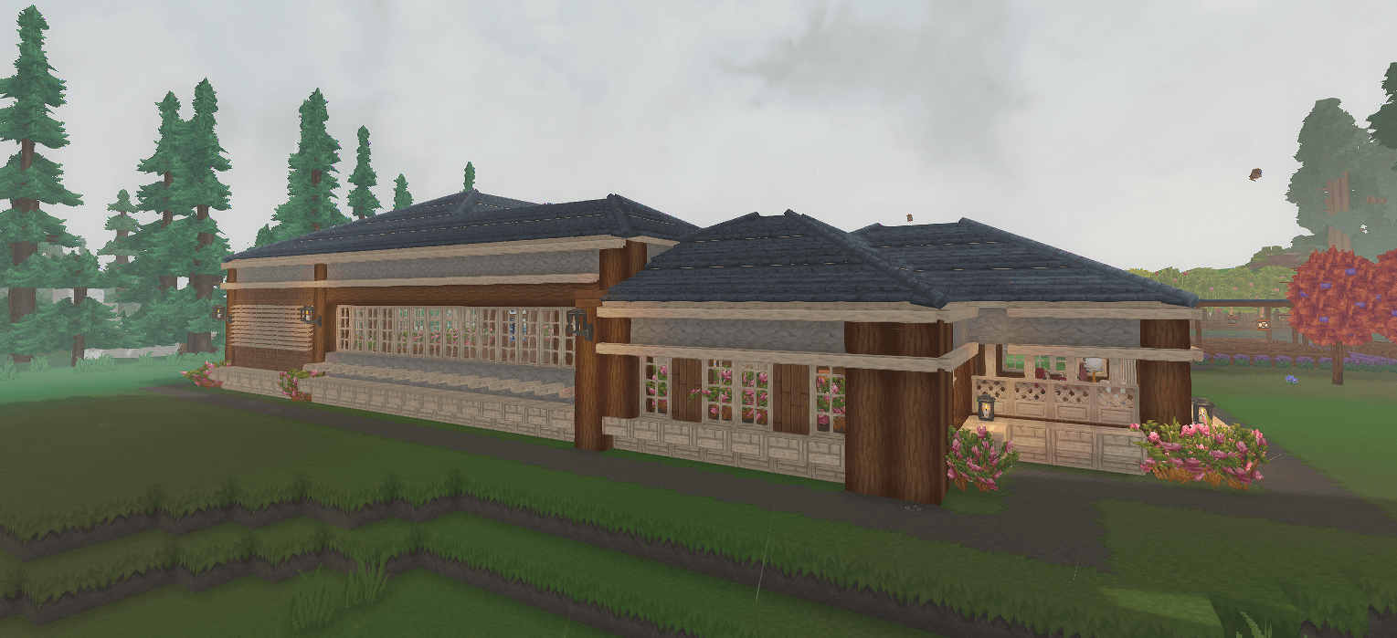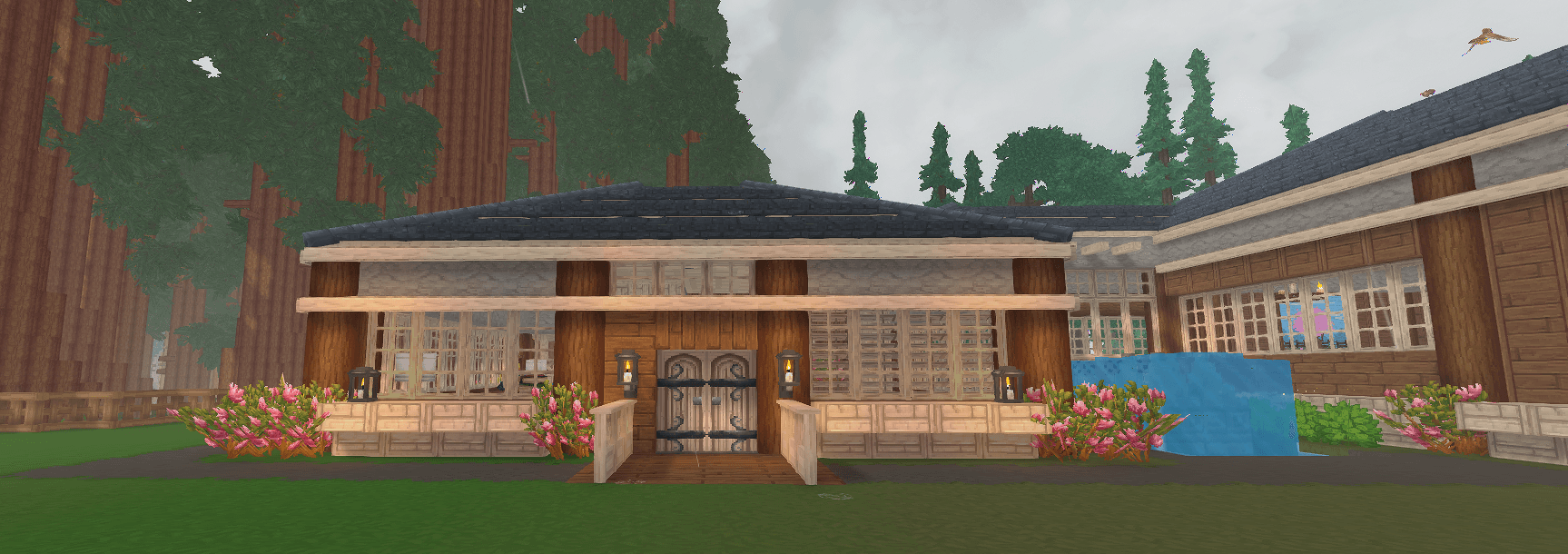 The exterior combines warm wood tones with light stone accents and layered roofing, giving the structure a refined yet welcoming presence. Covered walkways, decorative trim, and flower-lined planters soften the silhouette and help the house integrate naturally into forest, plains, or garden-style biomes. Large windows are used throughout the build to maximize natural light and maintain a constant visual connection with the surrounding environment and courtyard.