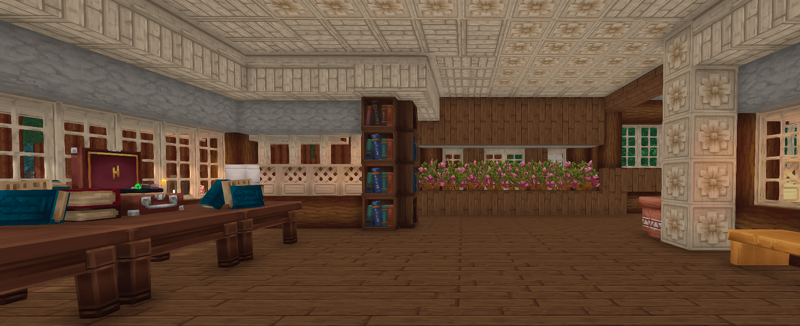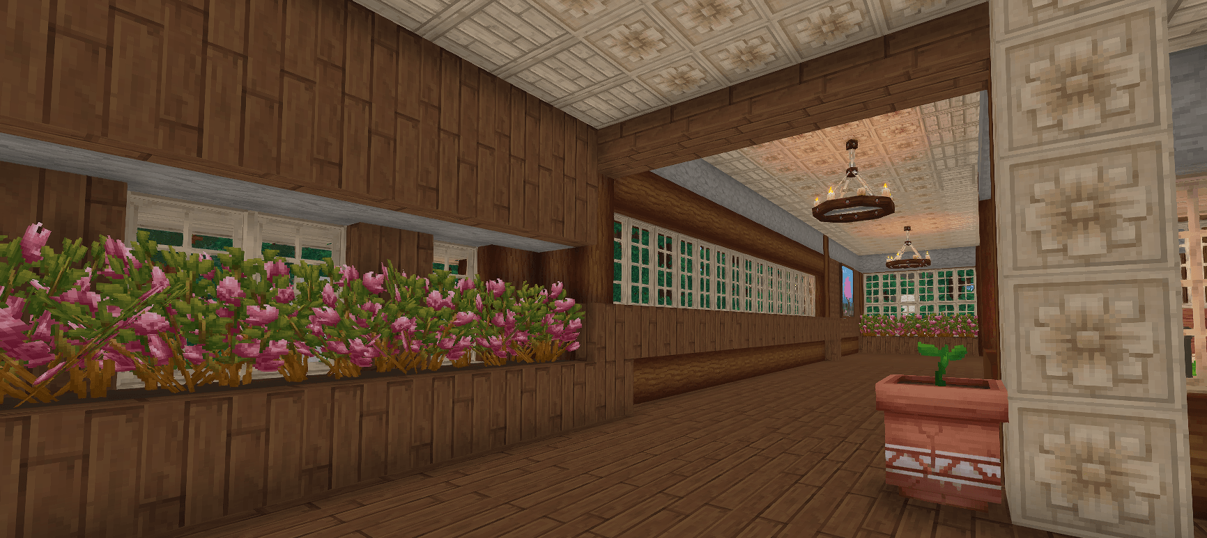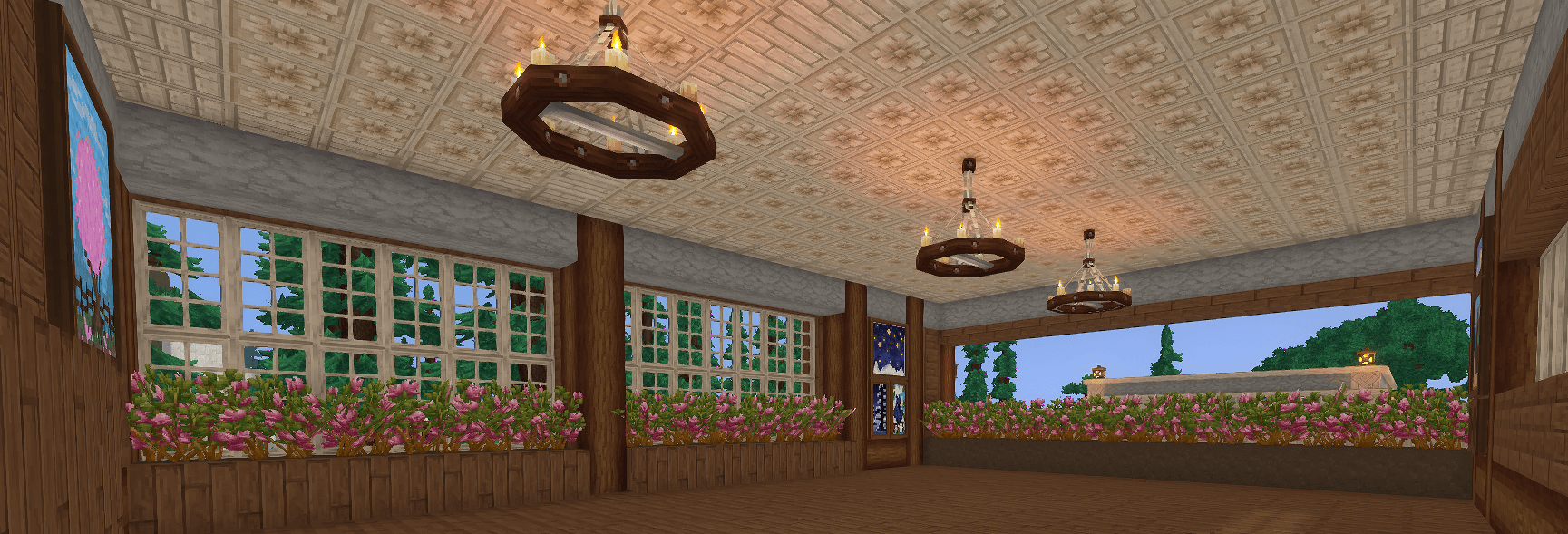 The exterior combines warm wood tones with light stone accents and layered roofing, giving the structure a refined yet welcoming presence. Covered walkways, decorative trim, and flower-lined planters soften the silhouette and help the house integrate naturally into forest, plains, or garden-style biomes. Large windows are used throughout the build to maximize natural light and maintain a constant visual connection with the surrounding environment and courtyard.