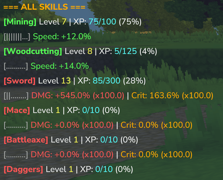 Level up your Hytale experience! Gain XP from mining, chopping, and combat with ANY weapon (even custom ones!). Unlock permanent speed, damage, and crit bonuses. 400 levels per skill, pre-balanced. Just drop in your Mods folder and play!