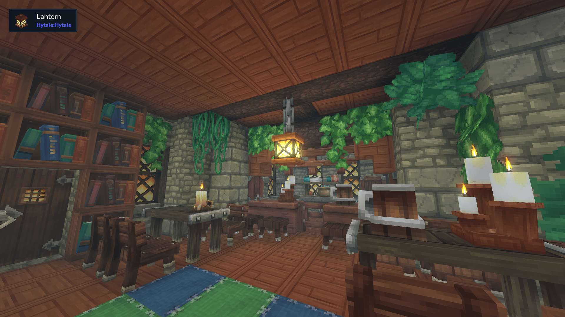 A cozy, fully detailed fantasy tavern built for Hytale. Featuring a timber-and-stone exterior, ivy-covered walls, warm glowing windows, and a richly furnished interior with lantern light, wooden beams, bookshelves, and bar seating.