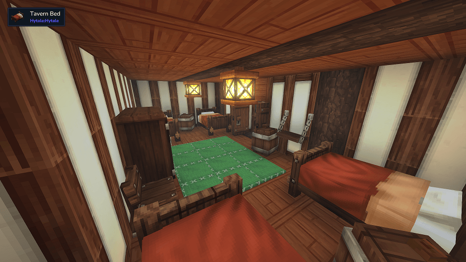 Proto's HyFantasy Series: Tavern. A cozy fantasy tavern for Hytale featuring a detailed timber and stone exterior, warm glowing windows, and a fully furnished, lantern-lit interior perfect for villages or roleplay worlds.