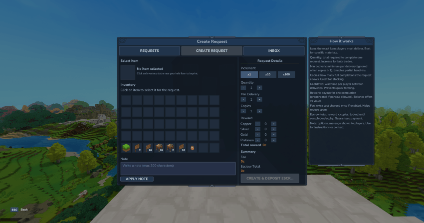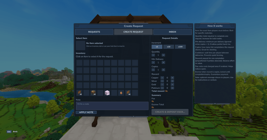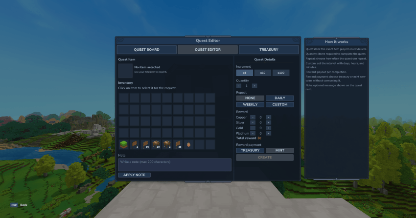 позволяет игрокам публиковать материальные запросы с гарантированным Монетные наградыВ то время как администраторы могут создавать Сервер-контролируемые квестыВсе с безопасной, настраиваемой и эксплуатируемой экономикой.