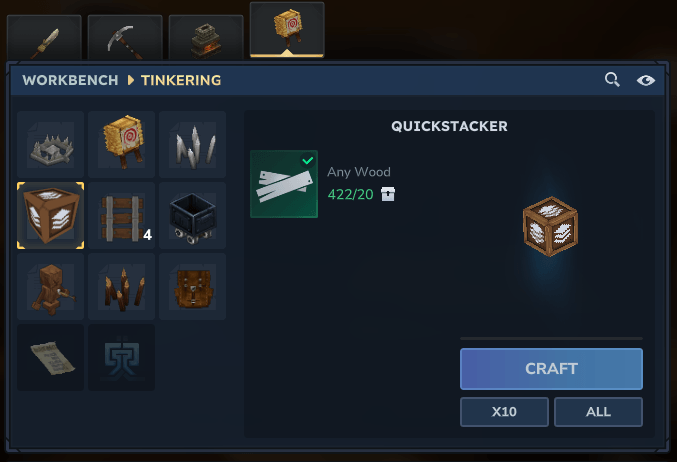 Этот мод содержит пользовательский блок, который может быть создан на Workbench во вкладке Tinkering. Взаимодействие с этим блоком быстро сложится в близлежащие сундуки, избавив вас от хлопот по набору команды.