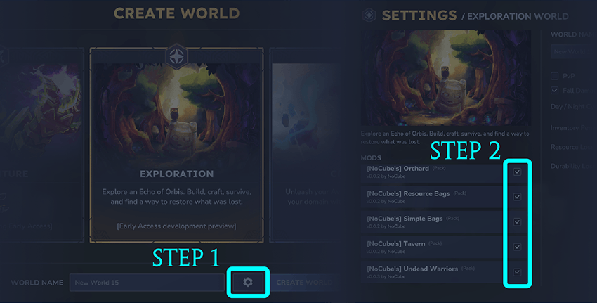 После загрузки мода обязательно перейдите в World Settings (Шаг 1) Проверьте коробки рядом с желаемыми модами, прежде чем создавать мир (Шаг 2). Это важно, иначе мод не будет включен в выбранном мире.