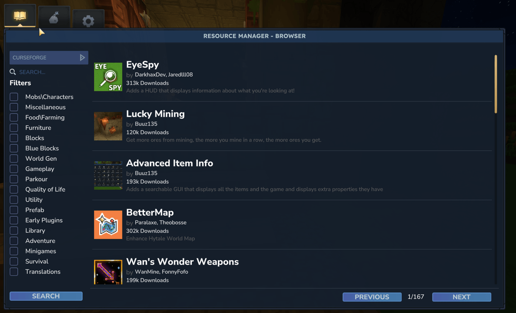 Resource Manager позволяет просматривать моды и пакеты данных из CurseForge и Modtale в игре с помощью интерфейса GUI.