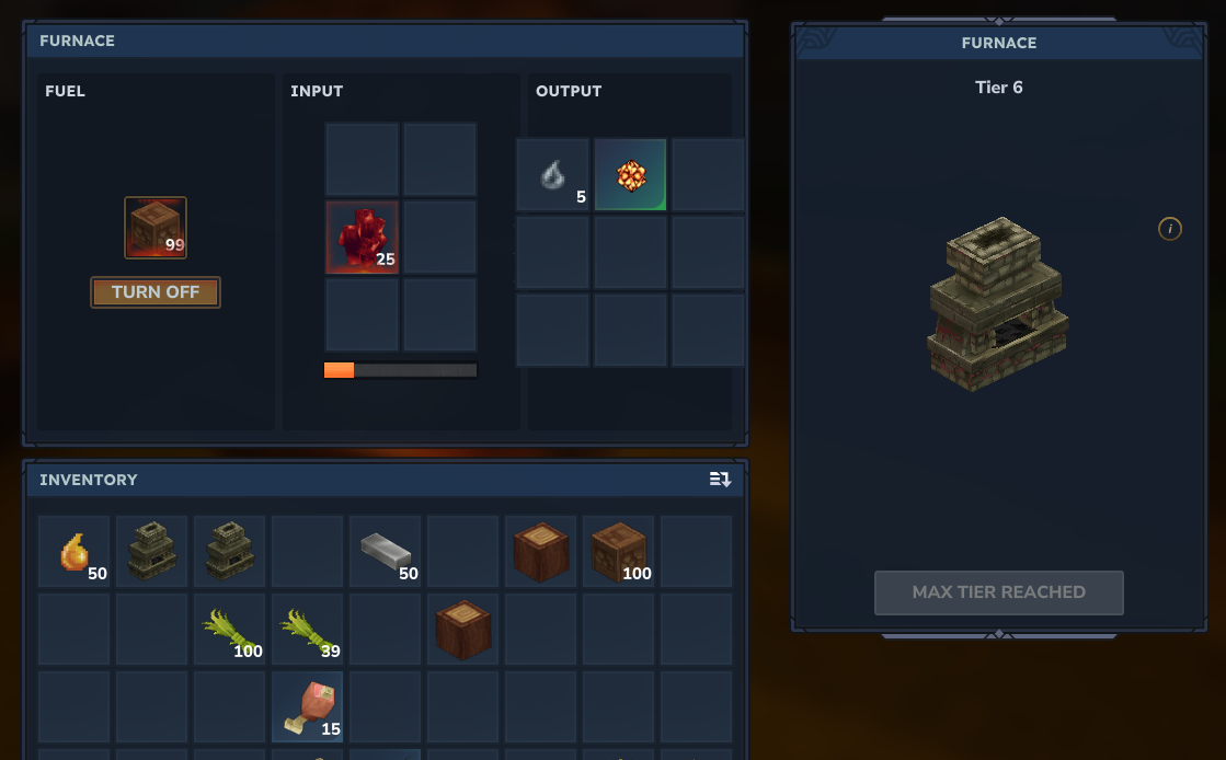 Имеет 6 плавильных слотов с 6 модернизируемыми уровнями. Каждый уровень уменьшает время, необходимое для приготовления пищи. Производит огненную эссенцию вместо древесного угля с меньшей скоростью.