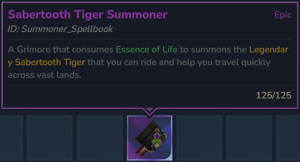 The mobs in this mod must be summoned using an magical Spellbook crafted in the miscellaneous category at Arcanist's Workbench. By combining 5 Medium Leather, 15 Essense of the Void, 30 Bone Fragments and 45 Essense of Life, you can create a Magical Spellbook that will summon a rideable Sabertooth Tiger.