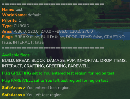 SafeAreas is a staff-friendly region management plugin that lets you define protected areas and control player behavior using clear, easy-to-understand flags. Perfect for spawns, towns, events, and administrative zones.