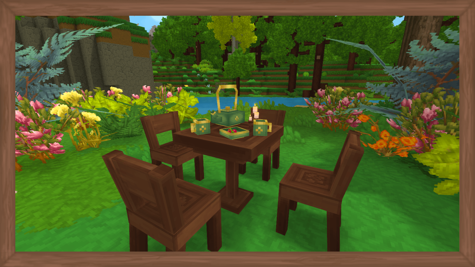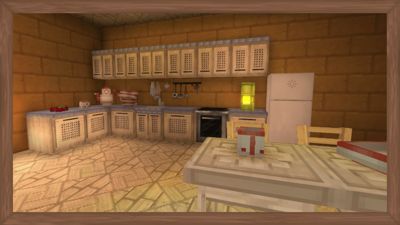 The mod includes 4 kitchen furniture sets and 4 table and chair sets, suitable for both modern and more relaxed, Scandinavian-style interiors. In total, the mod features 40+ items, covering all furniture and decor variants. It adds a functional refrigerator for food storage and a kitchen stove that allows you to cook. For atmosphere, there are wall-mounted decor elements and 4 tea sets with functional teapots — letting you brew tea and take a small break from your adventures.