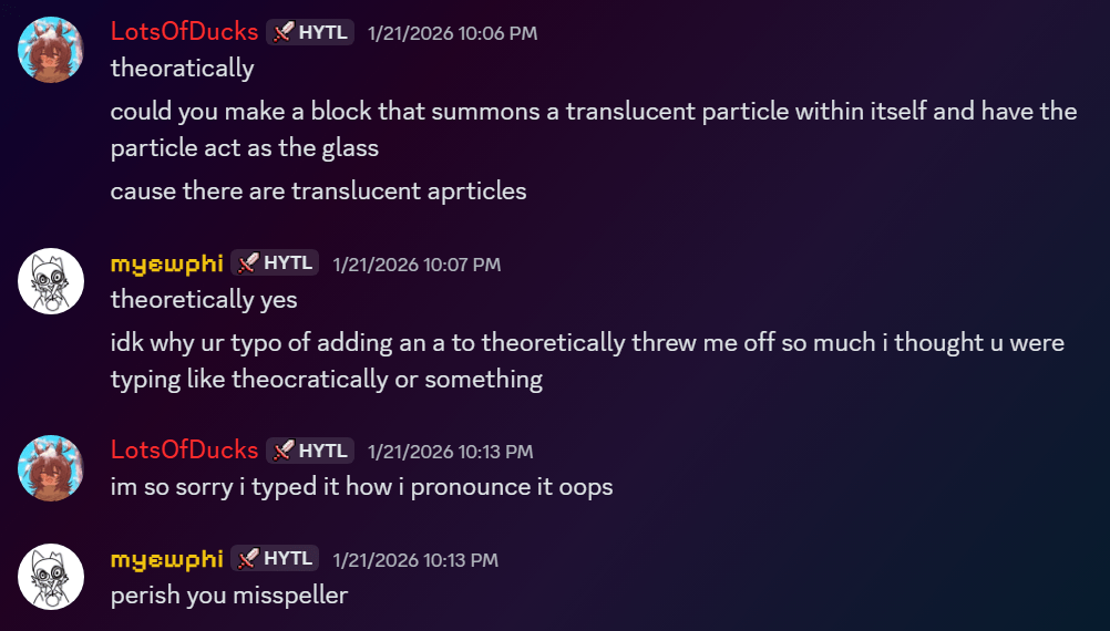 While whining about the lack of translucency for item/block textures in Hytale, a friend asked "aren't particles translucent? couldn't you spawn a particle to act as translucent glass?" and well, like, yeah!