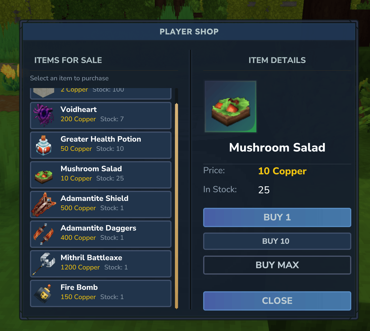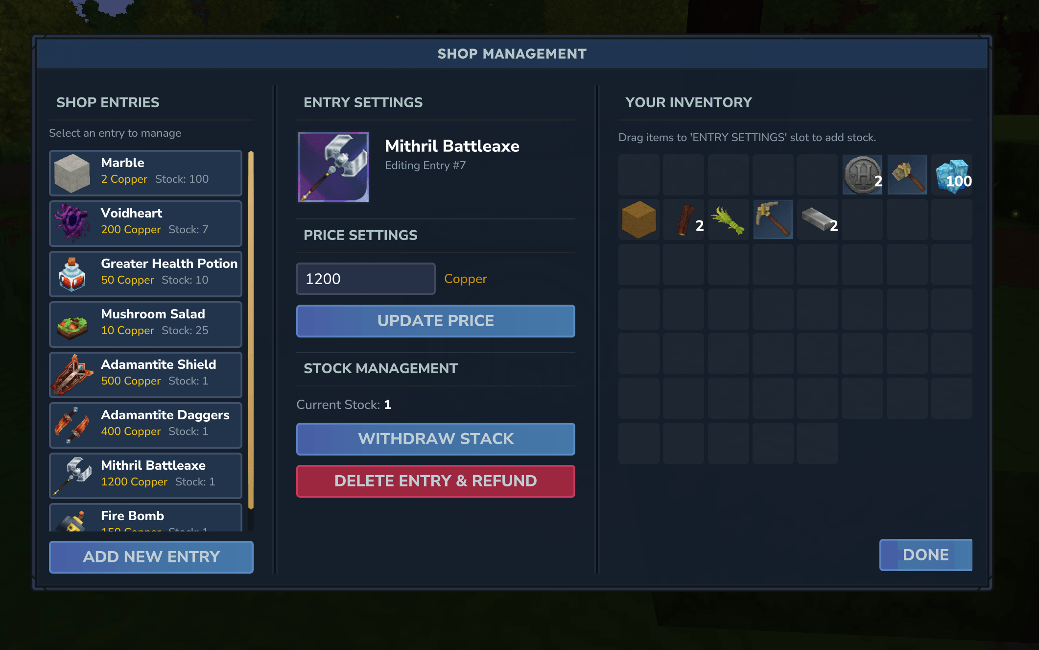 - Price Control: Set custom prices for each item in your shop (in Copper coins).