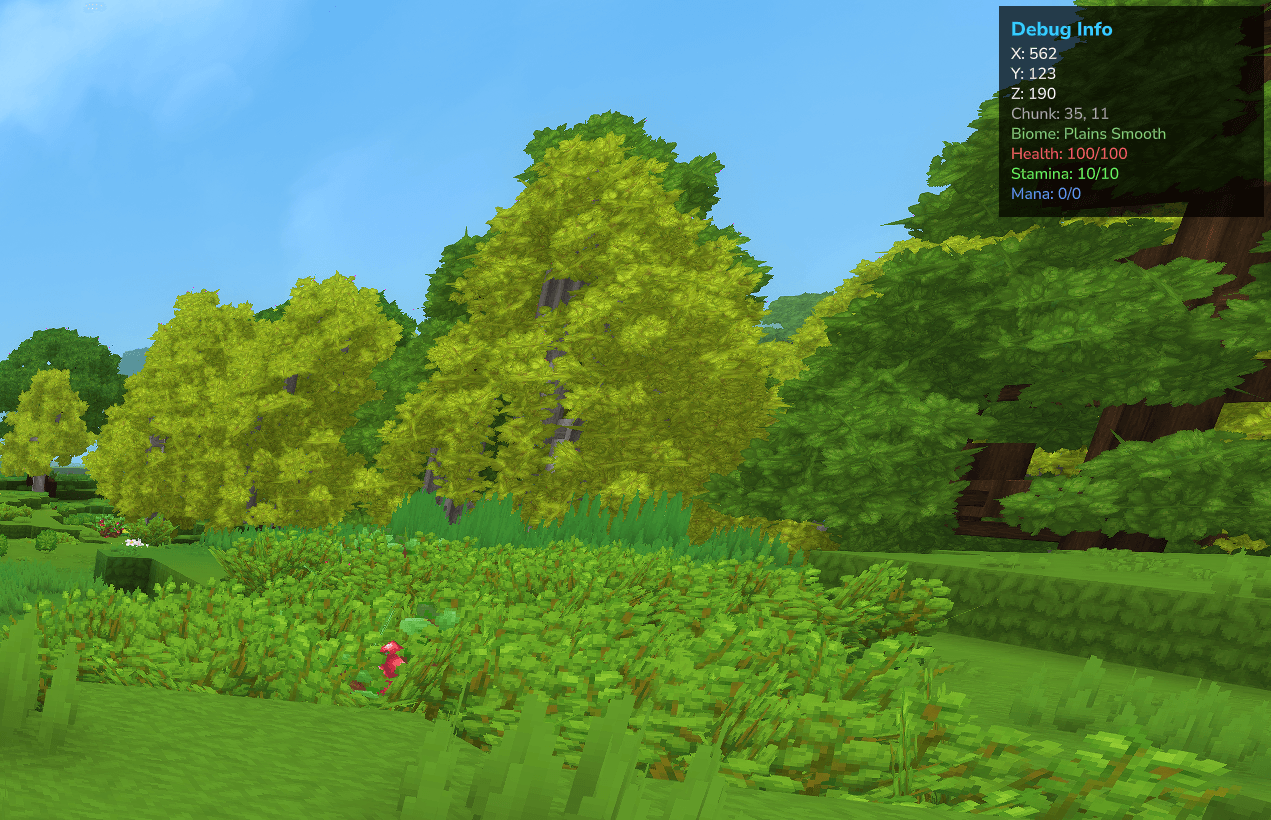 Displays a toggleable debug HUD showing player coordinates (X, Y, Z), chunk position, biome name, health, stamina, and mana. Toggle with /debug command. Disabled by default.