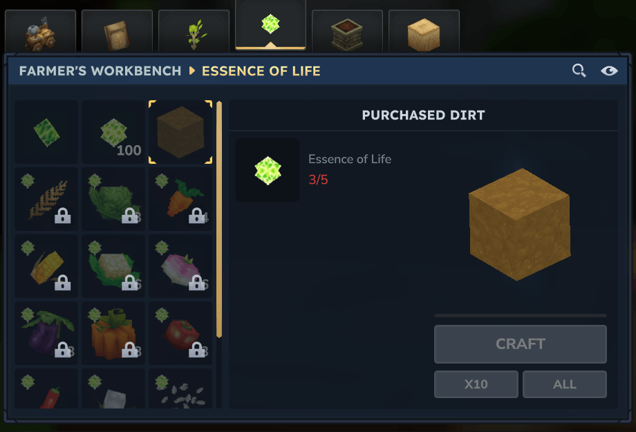 Мод позволяет вам покупать грязь с фермерской скамьи в вкладке Essence для 5 жизненных эссенций.