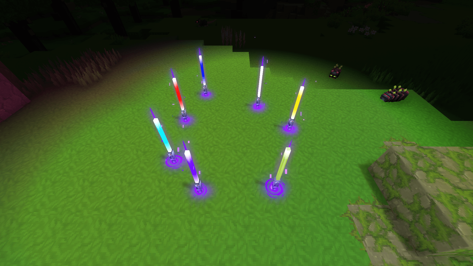 Этот мод добавляет 7 цветов светового меча (различия цвета косметические). Световые мечи могут быть изготовлены в наковальне 3-го уровня (оружейная скамейка) с использованием железных брусков, цветных хрустальных осколков и камня, коррелирующего с цветом светового меча.
