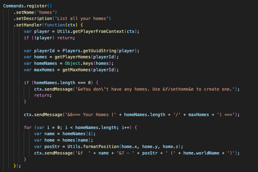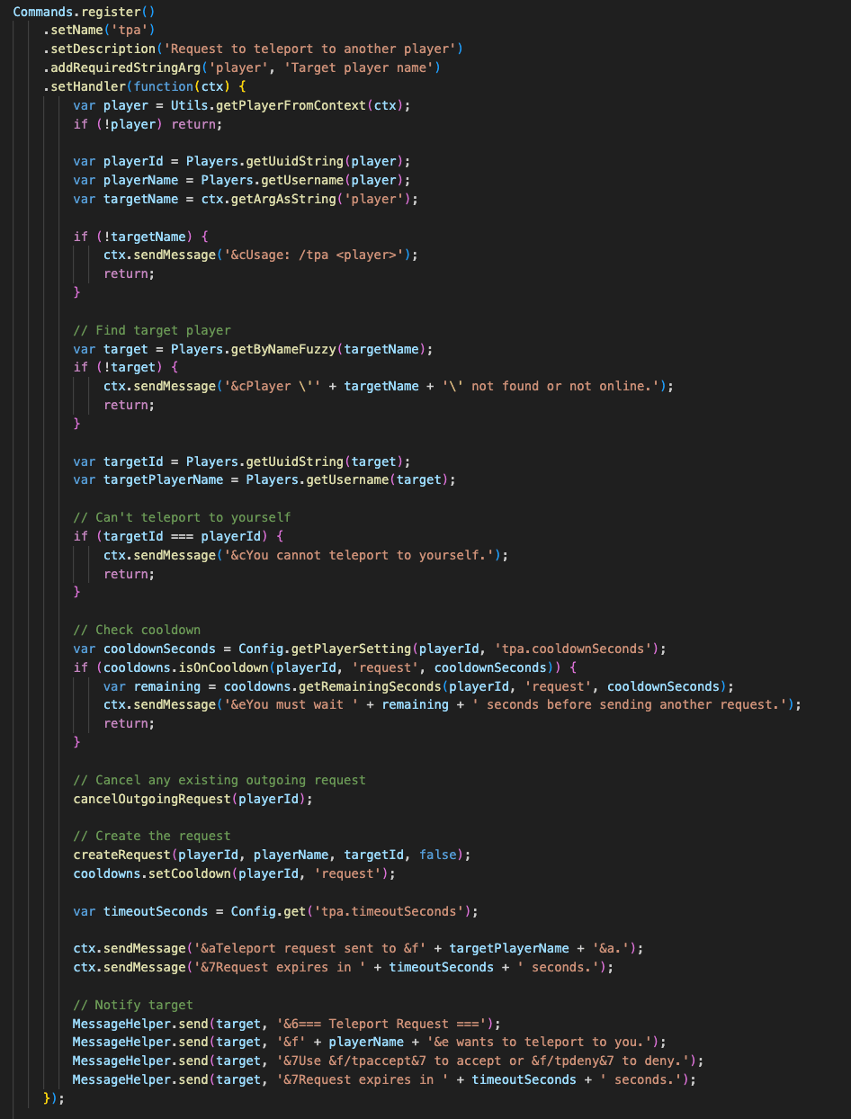 Utils.getPlayerFromContext(ctx)- Get player from commandUtils.formatTime(seconds)- Format time durationsUtils.formatPosition(x, y, z)- Format coordinatesUtils.createCooldownTracker()- Easy cooldown managementUtils.teleportWithWarmup()- Teleport with countdown
