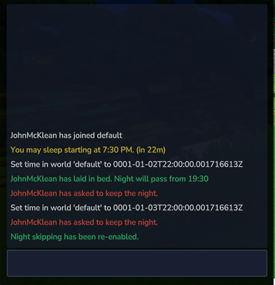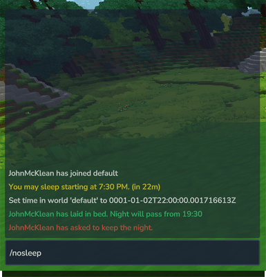 /nosleep– Request that the night should not be skipped/cancelsleep– Cancel an active no-sleep request (might change this to allowsleep)