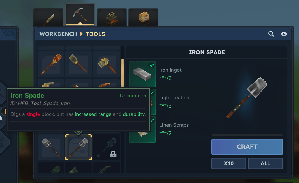 Они работают аналогично киркам, нарушая только один блок и имея расширенный охват по сравнению с лопатами по умолчанию.