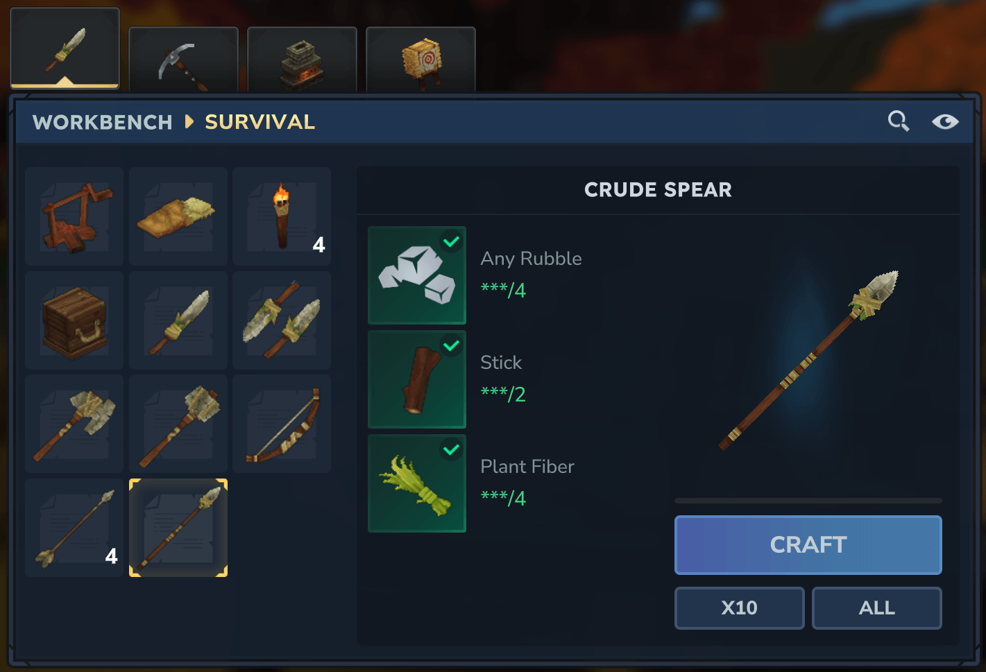 - Spears are crafted using the Blacksmith´s Anvil, except for the Crude Spear, which is crafted at the Workbench.