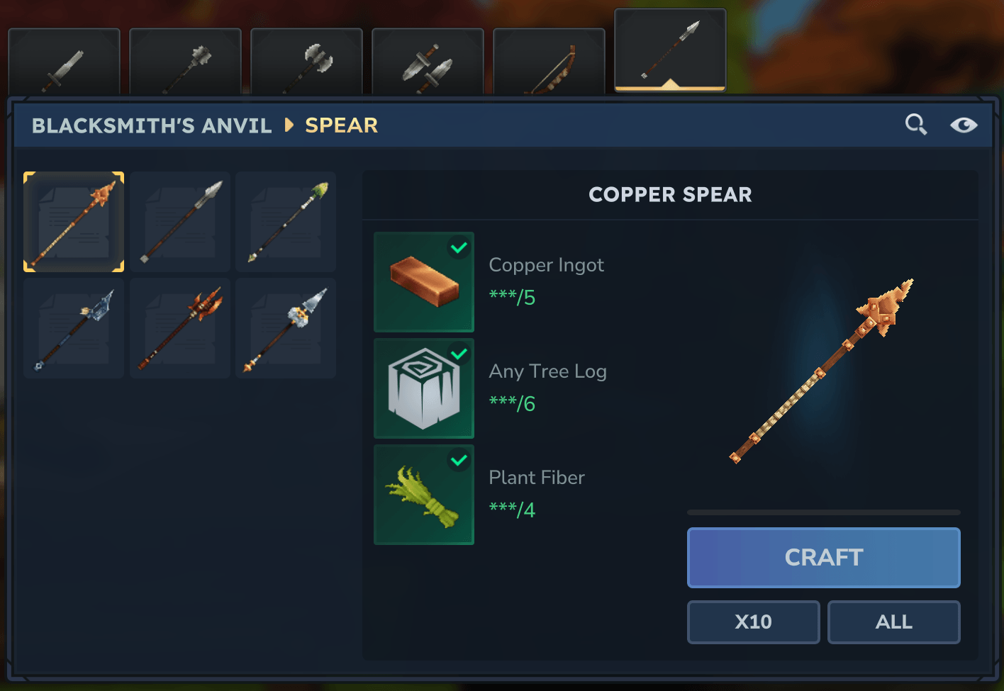 - Spears now have their own tab in the Blacksmith Anvil Workbench.